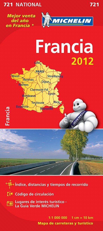 La edición actualizada del Mapa National Francia 2012, editado a escala 1/1 000 000, incorpora nuevos contenidos: un índice de localidades, cuadro con las distancias, tiempos de recorrido, código de circulación, así como lugares e informaciones de interés turístico que han sido extraídos de La Guía Verde MICHELIN.