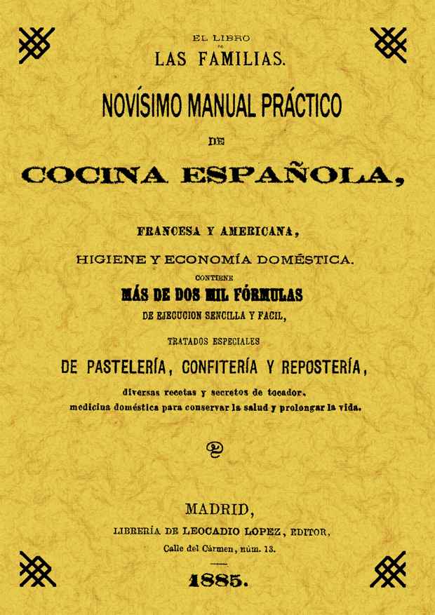 El libro de las familias o novísimo manual práctico de cocina española, francesa y americana, higiene y economía doméstica. Contiene más de dos mil fórmulas de ejecución sencilla, además de tratados espeiales de pastelería, confitería y repostería, y diversas recetas y secretos de tocador. También se incluyen trucos de medicina doméstica para conservar la salud y prolongar la vida.