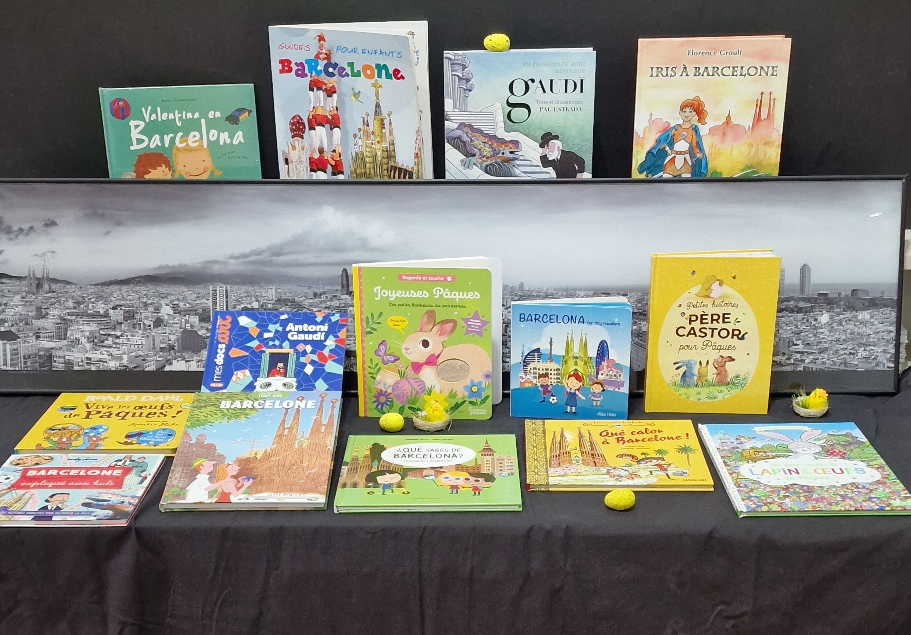 Youpi ! C’est Pâques ! Il y a plein d’oeufs dans la librairie ! Qui va en ramasser le plus ? Pénélope la Poule ? Iris à Barcelone ? La Petite Poule Rouge ? Mirette qui fait une enquête à Barcelone ? Le Petit Lapin Malin ? Antoni Gaudí ? Petit Koala ? Pierre Lapin ? Ou Choco le Lapin de Pâques ?