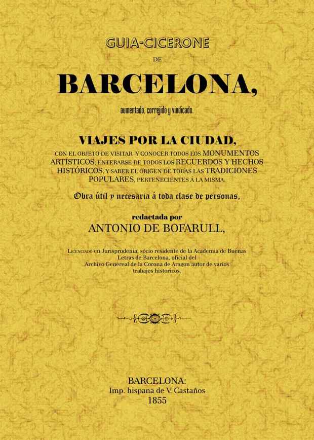 Guía-cicerone de Barcelona, aumentado, corregido y vindicado. Viajes por la ciudad con el objeto de visitar y conocer todos los monumentos artísticos, enterarse de todos los monumentos artísticos, enterarse de todos los recuerdos y hechos históricos y saber el origen de todas las tradiciones popular...