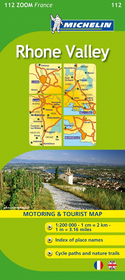El Mapa Zoom Rhone Valley, editado a escala 1/200 000, presenta la leyenda en dos idiomas (francés e inglés), índice de localidades y señalización de pistas para bicicletas y vías verdes.