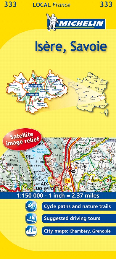 La edición actualizada del mapa Local Isère, Savoie editado a escala 1/150 000, incorpora la señalización de pistas para ciclistas, vías verdes, sugerencia de itinerarios, así como los planos de las ciudades de Chambèry y Grenoble.