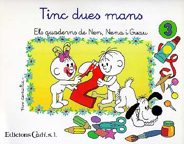 En aquest quadern fem tot això: descobrim les nostres mans i aprenem el bo i el dolent que podem fer amb elles, ens expressem amb la cara i amb les mans, reconeixem la quantitat 2, seriem amb els colors vermell i blau, identifiquem la forma quadrada i juguem amb cercles i quadrats, desenvolupem la la destresa manual i la coordinació visomanual, treballem amb el concepte molt-poc, ens iniciem amb el treball amb tisores i comencen a jugar amb un laberint.
