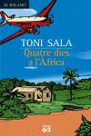 Dictadures, misèria, illes i palmeres, goril·les, cocodrils i aventures. A través del viatge d’uns dies al cor del continent africà, Toni Sala ens proposa una reflexió sobre l’actualitat literària de l’aventura i sobre un dels temes que fan córrer més tinta últimament: el diàleg intercultural. Més enllà de la retòrica i dels tòpics, ¿podem fer compatible la diversitat amb la pròpia cultura? Quatre dies a l’Àfrica és el relat d’un viatge tan divertit com seriós, amb avioneta, cayuco, quatre per quatre o a peu, per constatar, sobre el terreny i sobre un mateix, que el tracte amb els altres no és una qüestió banal, ni gens fàcil.L’estil precís, l’observació aguda i la destresa narrativa que tants lectors van apreciar en la Petita crònica d’un professor a secundària, i que impregna tota l’obra de Toni Sala, són també els puntals que fan d’aquests Quatre dies a l’Àfrica una festa de la intel·ligència i una lectura deliciosa.Toni Sala va néixer a Sant Feliu de Guíxols l’any 1969. El seu primer llibre, Entomologia (1997), va guanyar el Premi Documenta. Pere Marín (1998) va ser la seva primera novel·la. Amb Bones notícies (2001) va proposar una mirada torbadora a les intimitats de la vida en parella. Petita crònica d’un professor a secundària (2001) va donar-lo a conèixer al gran públic. Amb Goril·la blanc (2002) va introduir-se en el gènere de l’autobiografia. A Un relat de la nova immigració africana (2003) va narrar les aventures d’un gambià a Catalunya. La seva novel·la Rodalies (2004) va guanyar el premi Sant Joan. Totes aquestes obres són al catàleg d’Edicions 62.