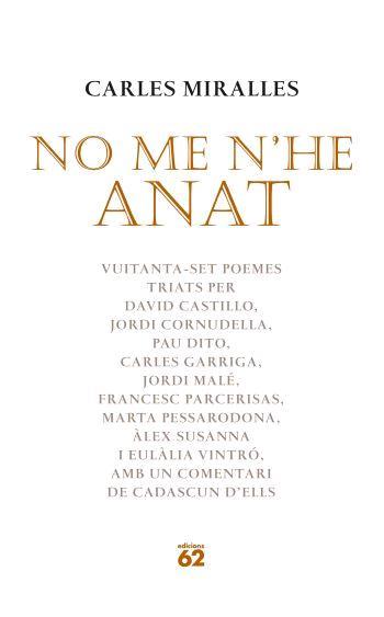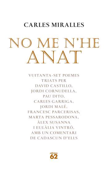 No me n'he anat és una tria de vuitanta-set poemes de D'aspra dolcesa feta per nou lectors i lectores de l'obra de Miralles, que n'ofereixen una valoració de conjunt, amb els matisos de cada cas, exposant les raons per la seva tria particular.